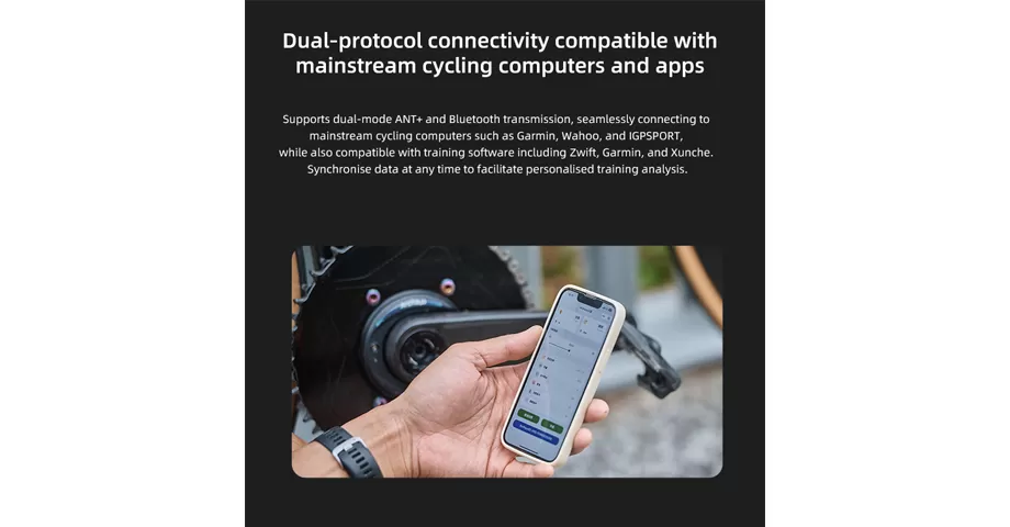 Dual-protocol connectivity compatible with mainstream cycling computers and apps. Supports dual-mode ANT+ and Bluetooth transmission, seamlessly connecting to mainstream cycling computers such as Garmin, Wahoo, and IGPSPORT,while also compatible with training software including Zwift, Garmin, and Xunche. Synchronise data at any time to facilitate personalised training analysis;